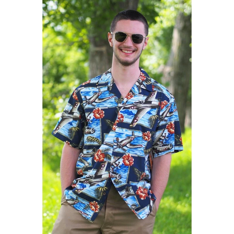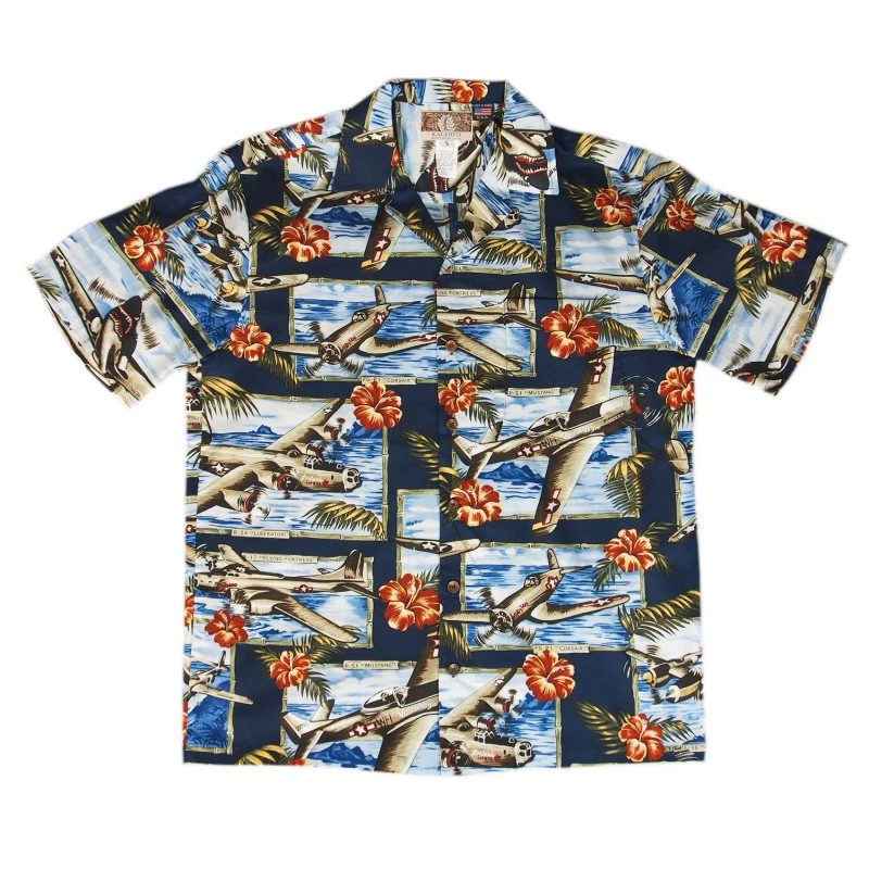 Imprimé d’avions représentatifs du théâtre d’opération du Pacifique durant la seconde guerre mondiale. Riches en couleur, légères et confortables, ces chemises sont les immanquables de la saison estivale.