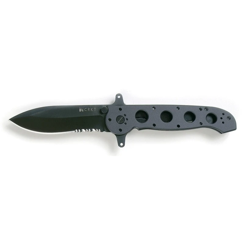 Lame semi-dentée acier AUS 8, revêtement nitrure de titane noir avec « flipper », à cran intérieur et à bouton double, manche à trous 13,5 cm en aluminiun anodisé gris, avec clip.