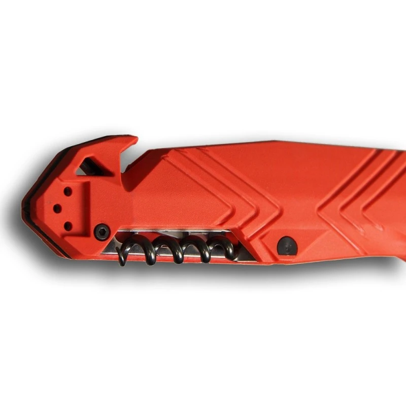 Parfaitement résistant à la corrosion, la lame est constitué de Nitrox dont le tranchant est mixte lisse + serration. Il dispose d’un brise vitres, d’un tire-bouchon et d’un clip ceinture reversible. Le manche est constitué de deux plaquettes en polymère chargé de fibres de verre. Ces plaquettes sont vissées à la mécanique par des vis en acier inoxydable dont l’une d’elle loge astucieusement une lame coupe sangle. Cette lame courbe et interchangeable est conçue pour couper sangles, cordes, ceintures de sécurité.