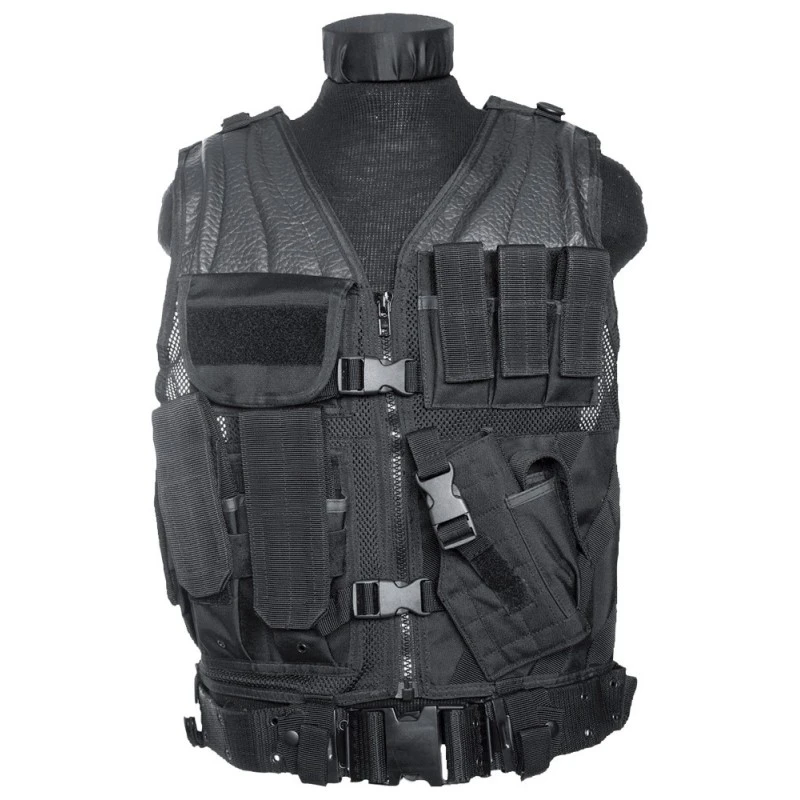 Un étui holster, 3 porte-chargeurs 9mm, 1 porte-boussole, 1 porte-pansements, 3 porte-chargeurs type MAC10 ou MP5, réglable en hauteur et largeur. Poignée d’extraction.