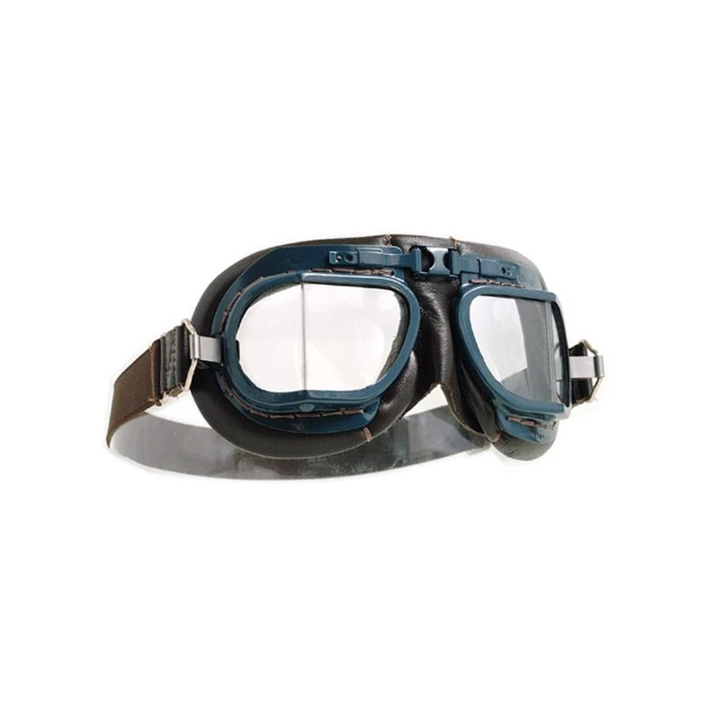 Masque facial en cuir souple marron, monture en laiton massif peint en bleu RAF avce des lentilles angulaires traditionnelles.