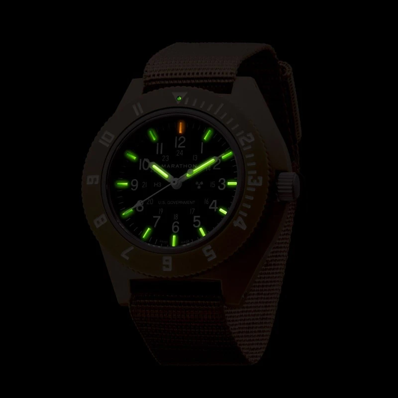 La montre Marathon Navigator d’aujourd’hui a été revisité pour la dernière fois en 2019 avec l’ajout d’un verre saphir, d’une couronne en acier et d’un anneau de retenue en cristal, ainsi que d’une trappe de batterie facile d’accès. Doté d’un mouvement à couple élevé, avec un indicateur EOL (fin de vie) pour vous avertir lorsqu’il est temps de changer votre batterie ; des tubes de tritium aux index ainsi qu’aux aiguilles des heures et des minutes, pour une meilleure lisibilité, de jour comme de nuit. Un boîtier de 41 mm ultra léger en fibre composite résistant aux chocs pour une meilleure durabilité, et une lunette bidirectionnelle de 12 heures.
