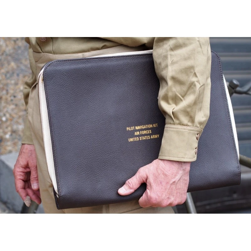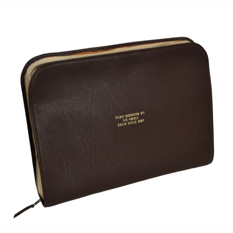 En cuir grainé, avec de nombreux compartiments intérieurs permettant de ranger : cartes, instruments de navigation. Dimensions : 42 x 28 x 7 cm. Marquage extérieur. Repro du modele des annees 40. Fabrication française.