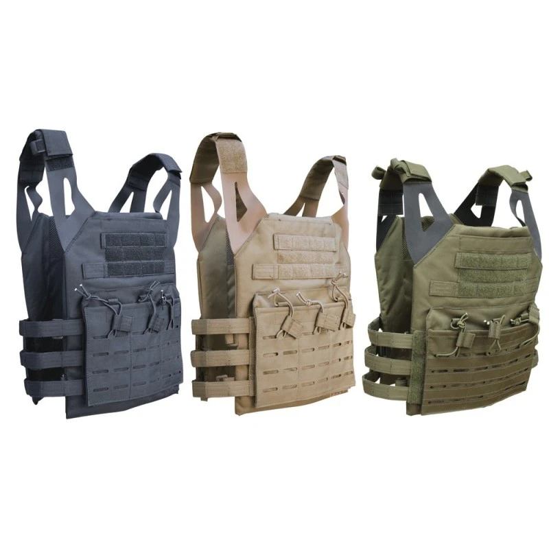 Trois porte-chargeurs intégrés sur le devant du porte plaque. Ajustable aux épaules par velcro. POche dorsale et ventrale afin d’y intégrer les plaques balistique.