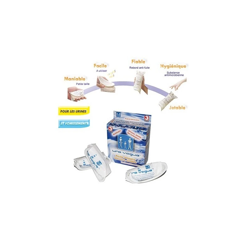 URO VOGUE™ est la première poche urinaire unisexe. Réutilisable, jetable conçue pour les hommes, les femmes, et les enfants. Discrète, très pratique d’utilisation en cas d’absence de sanitaires. Une substance appelée LIQSORB® est placée à l’intérieure d’une poche en toile tissée. Cette substance est compasée de plusieurs éléments dont des polymères biodégradables qui absorbent l’urine et arrêtent instantanément le développement de bactéries. L’urine est ainsi solidifiée par un gel inodore, non-toxique contenu dans un sac. Après gelification, le système permet d’éviter tout débordement de substance vers l’extérieure de la poche. Disvrète, elle peut être rangée partout. La poche est munie d’une fermeture de type zip est réutilisable jusqu’à sa capacité totale de 800 ml. Biodégradable, elle respecte l’environnement. Boîte de 3 poches.