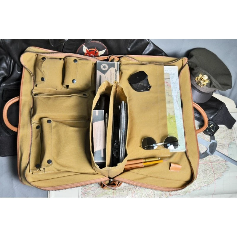 Voici le sac fourre-tout par excellence! Il recevait à l’origine les instruments de navigation de l’officier bombardier, mais par son coté pratique et sa grande contenance fait l’objet de convoitise de tout le personel de l’USAAF. Les nombreuses poches intérieurs permettent de ranger tout l’attirail des objets à l’usage de la navigation sans oublier les effets personnels !